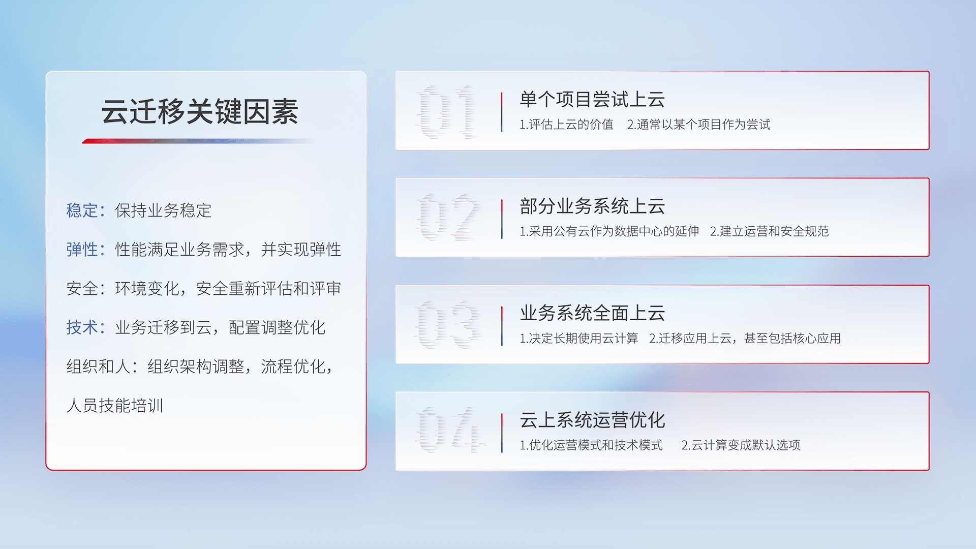 结合实际业务,,,,从规划设计、、、云平台选型、、云原生改造、、数据迁移、、、、集成交付,,,,迁移全过程为客户识别最佳上云路径,,,,做好风险识别管理,,,,设计网络架构、、、、身份权限、、安全审计合规、、操作审计、、、、日志审计、、监控告警策略、、多站点容灾设计等,,对云上基础设施进行整体规划,,,提升IT治理水平,,,以满足弹性、、高可用、、高性能的需求。。。。