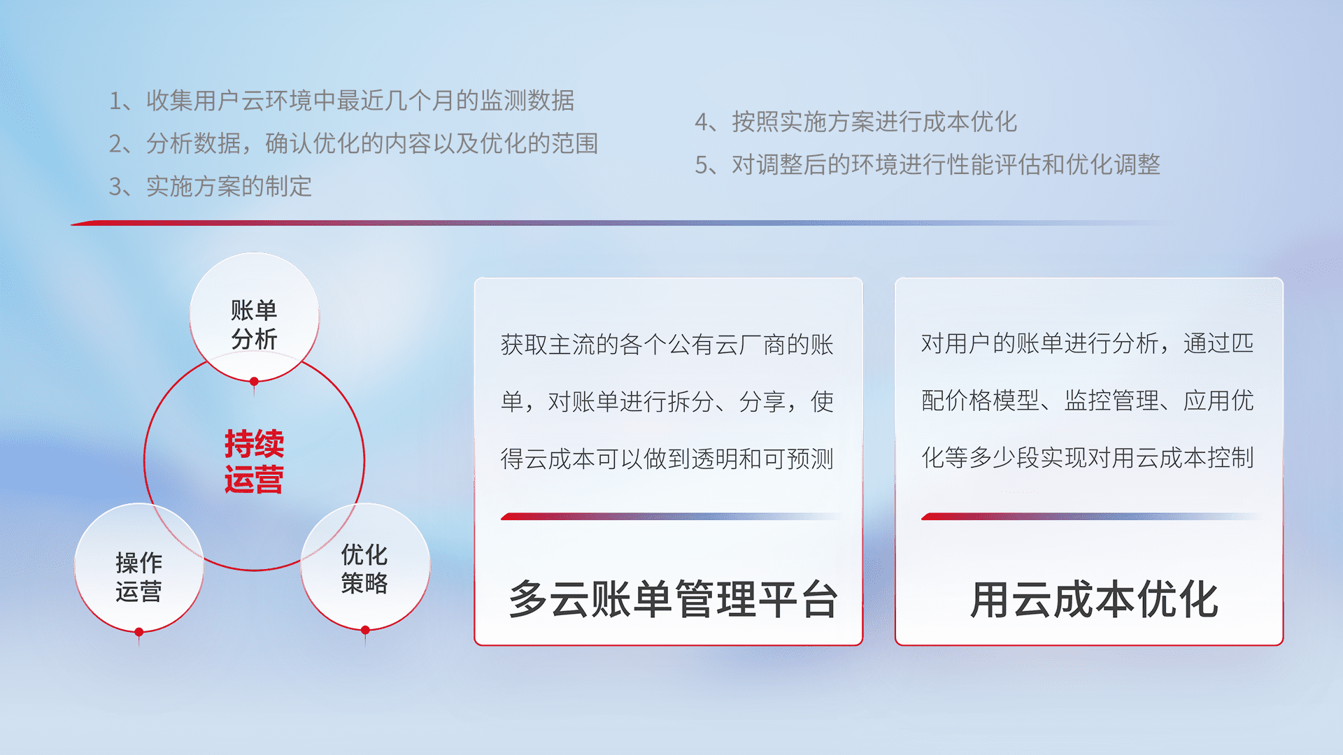 通过多云纳管,,,,以统一的资源数据模型把客户的云资源进行抽象和封装,,,进而实现对多云资源的统一操作,,,保障云资源管理的可靠性、、、稳定性与可用性。。量身定制化运维内容,,配置、、、开发运维、、补丁管理、、、、备份、、、监控、、、认证和访问管理、、、、审计和日常巡检等,,,,保障在用云过程中的可靠度,,,稳定度以及高可用率。。